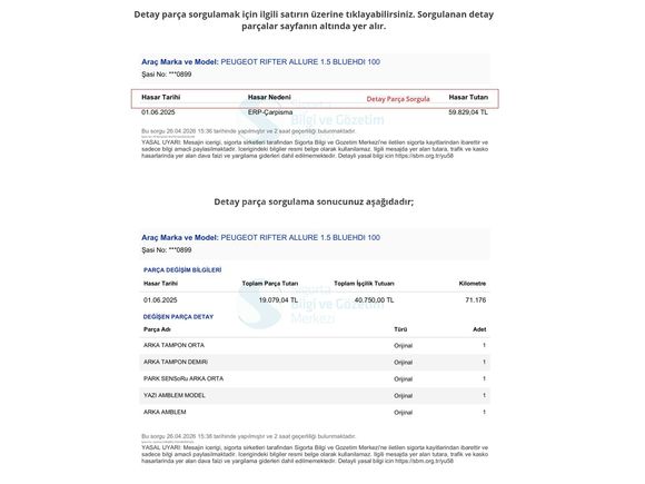 2021 Model Peugeout Rifter 1.5BlueHdi 130 Bg Otomatik Vites tir Değişen Boya yoktur. Talihsiz bir kaza sonucu araca arka tanpon değişmesinden dolayı 59.829 tl hasar kaydı işlemiştir. ( Yetkili serviste yapılmıştır) . Sadece 94.444 Km dedir. Bütün bakımları yetkili serviste yapılmıştır. Çalışmayan aksamı yoktur. 24.09.2026 tarihine kadar muayenesi mevcuttur.